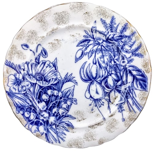 Plate, 7.25 inches diameter. Printed maker's mark for F. Winkle & Co. This pattern features two bunches of flowers opposite each other. The left features poppies and lily-of-the-valley and the right features fuchsias and small flowers with feathery-shaped leaves. The face of the plate is liberally sponged with gilding and the border consists of a simple gilded line.