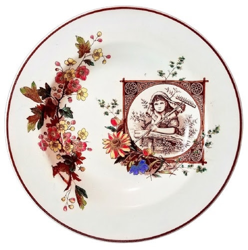 Plate, 9.75 inches diameter. Brown transfer with polychrome clobbering. Maker is F. J. Emery. This pattern features a square cartouche with circular opening in which a young girl holds a rake and leans forward on a wooden fence. The cartouche is framed by wildflowers and foliage. A spray of blooming hawthorn balances the pattern on the left.