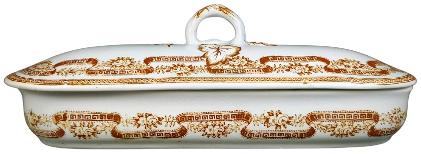 Lidded toiletry dish, 8.75 x 3 x 2.75 inches. Brown transfer. Unknown maker. This pattern features an undulating ribbon decorated with a Greek key pattern, laid over a wreath of roses. The lid has the addition of a molded handle decorated as a branch with tri-lobed leaves radiating outward.