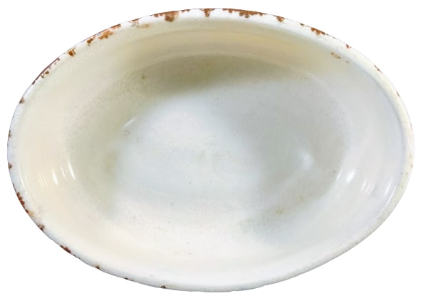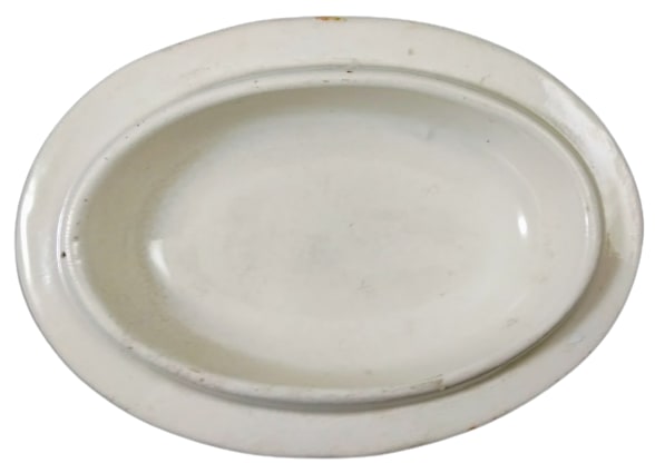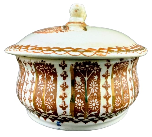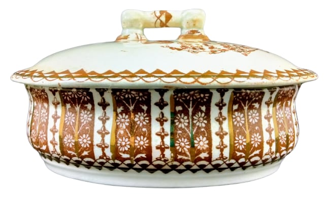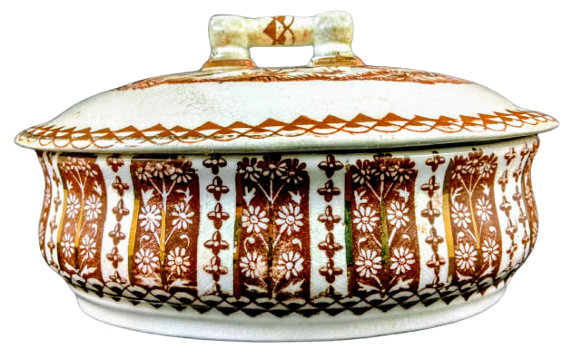 Soap dish, 6.5 x 4.5 x 1.75 inches. Brown transfer. Unknown maker. This unnamed pattern was most likely made by the same maker as the "School" pattern in this database, based on the identical border treatment. Here the central image, located on the lid, consists of a young girl leaning backwards on a wooden fence, blowing a simple horn in one hand. She is framed by tall flowering foliage on the left. The border consists of stacked, repeated triangles decorated with a single, overlaid, gilded line. The body is decorated with alternating vertical panels of stylized flowers, enhanced with gilded lines, which sit on top of the same triangle border seen on the lid.