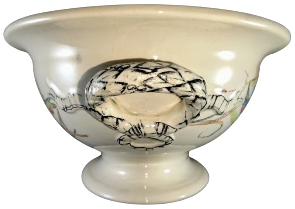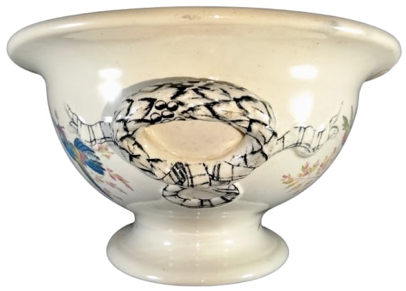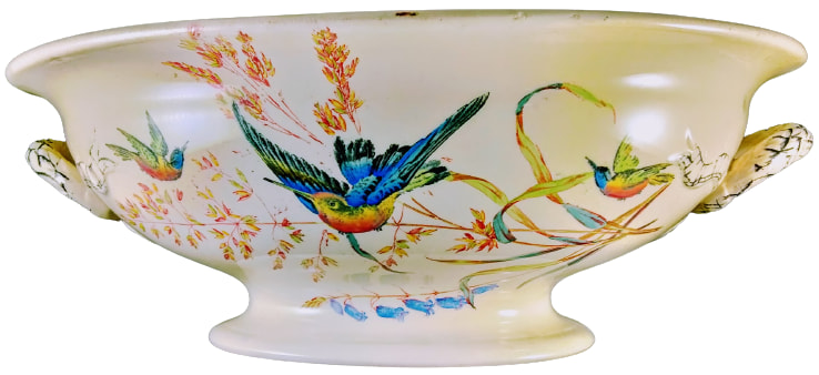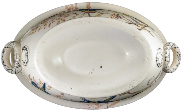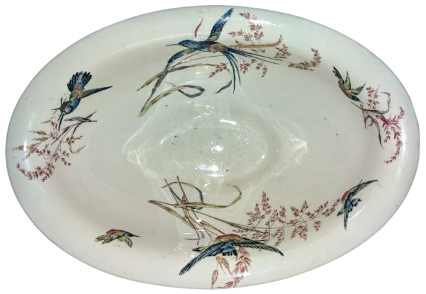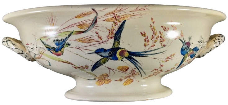 Lidless tureen, 11.5 x 8 x 4.25 inches (29.2x20.3x10.8cm). Brown transfer with polychrome clobbering. Impressed maker's mark for Thomas Furnival & Sons. This pattern features a variety of bejeweled hummingbirds in flight against a background of seeded grasses and flowers. The handles are molded and overlaid with a black transfer in the form of a ribbon.