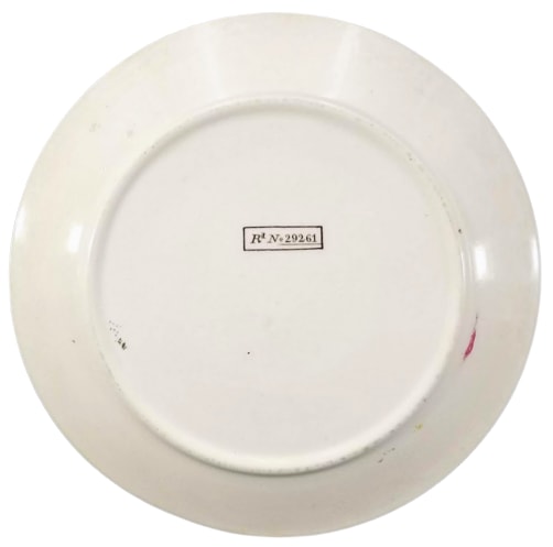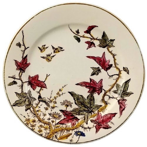 Plate, 8 inches diameter. Brown transfer with polychrome clobbering and gilding. Maker is A. Bullock & Co. The Rd. No. indicates a pattern registration date of 1885, but the production date is c. 1895-1915. This pattern features an ivy vine that originates at the bottom and curves around both sides of the plate. There are daisy-like flowers and other small wildflowers around the base of the ivy vine. At the top are seven small songbirds in flight.