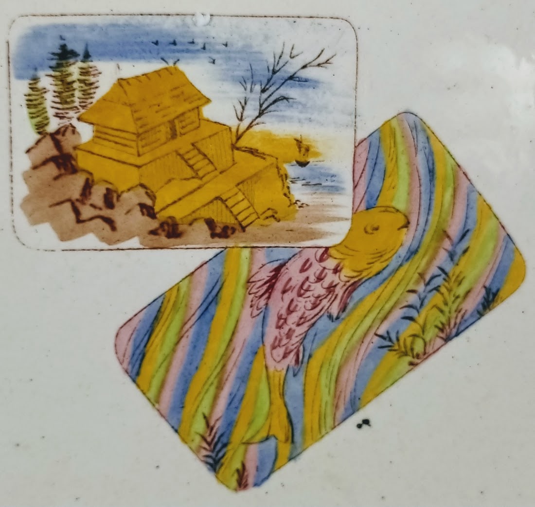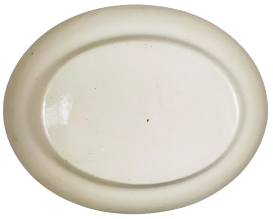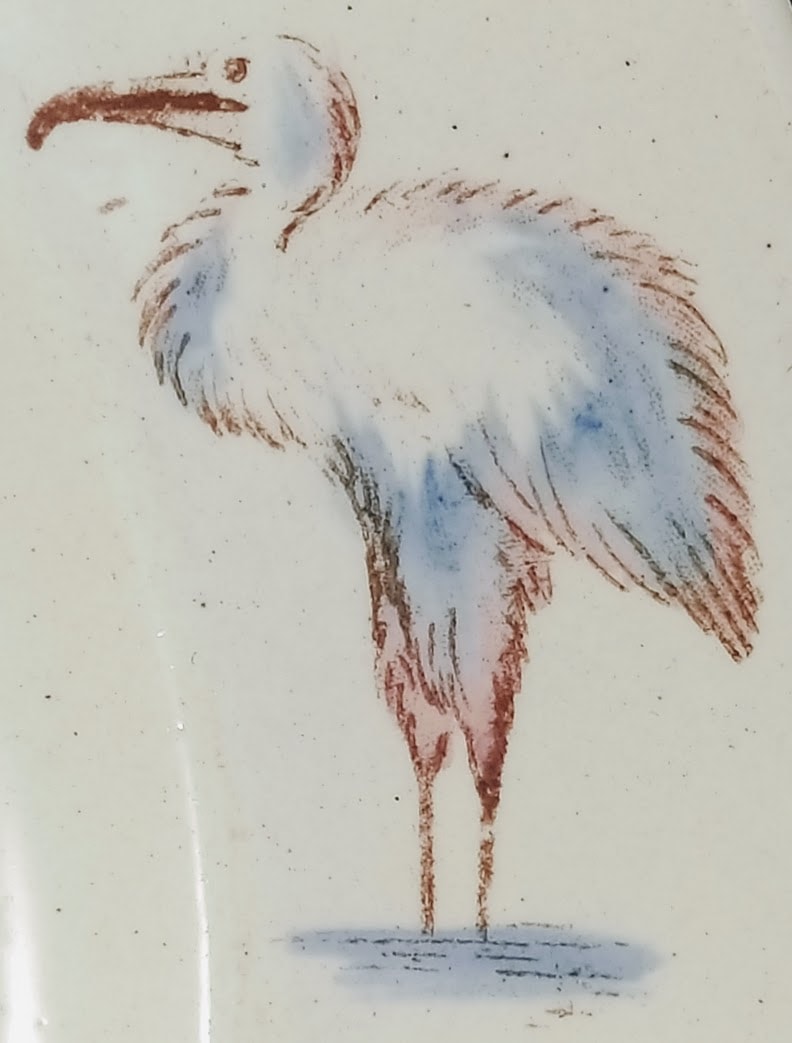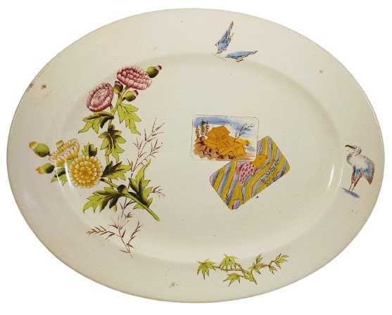 Platter, 13.5 x 10.5 inches. Brown transfer with polychrome clobbering. Impressed maker's mark for Thomas Furnival & Sons, c. 1871-1890. Like many Aesthetic patterns, this one depicts groupings of images in the Japonesque style. From left to right, there is a spray of chrysanthemums and grasses, two overlapping cartouches featuring a stepped temple or house and a koi fish, two pigeon-like birds pecking at food, a spray of bamboo, and a water bird like a crane.