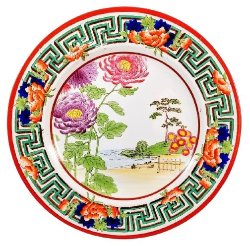 Plate, 10.25 inches diameter. Black transfer with polychrome clobbering. Printed and impressed maker's mark for Josiah Wedgwood. Green painted pattern number "A4695." Although this pattern was created c. 1879, this plate was produced c. 1891-1920. The pattern shows a distant seashore framed to one side by foreground chrysanthemums. A cluster of flowers in the right middle distance may represent chrysanthemums. The wide border consists of interlocking swastikas overlaid at intervals by clusters of peonies.