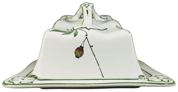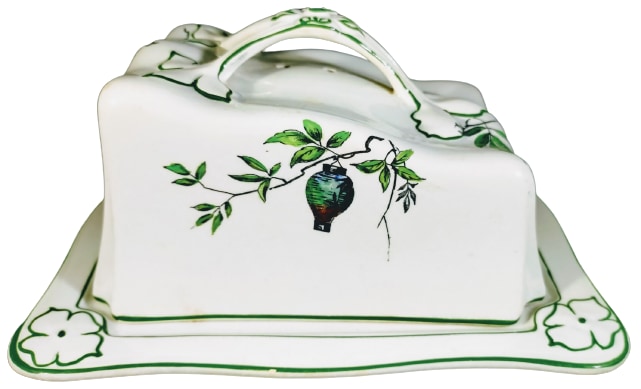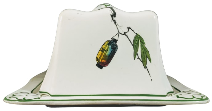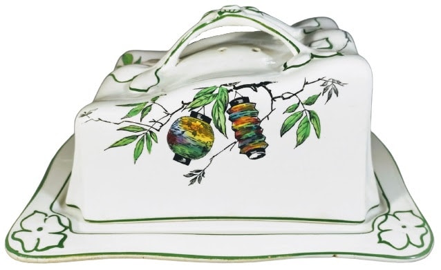 Cheese keep, 8 x 6.5 inches. Black transfer with polychrome clobbering. Printed maker's mark for the Newport Pottery Co. Ltd. This pattern features motifs on each side of the lid consisting of brightly-decorated Japanese paper lanterns hanging from branches. The rim of both lid and base, as well as the handle, are decorated with green accent line.