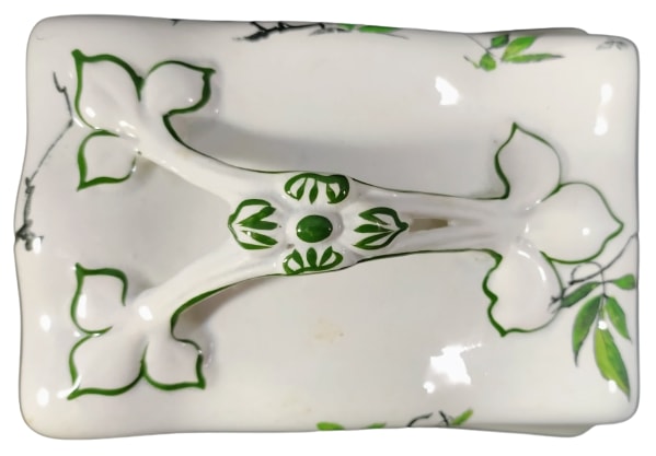 Cheese keep, 8 x 6.5 inches. Black transfer with polychrome clobbering. Printed maker's mark for the Newport Pottery Co. Ltd. This pattern features motifs on each side of the lid consisting of brightly-decorated Japanese paper lanterns hanging from branches. The rim of both lid and base, as well as the handle, are decorated with green accent line.