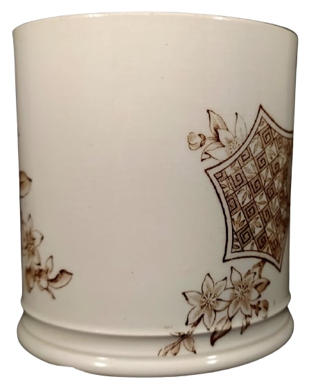 Mug, 3.625 inches tall. Brown transfer. Maker is G. & C., unknown, but possibly French. This pattern features two cartouches with scenes laid over a branch of blossoms. The primary cartouche has six lobes and features a scene of an Eastern Orthodox church. The other cartouche features a checkerboard sheet pattern of filled with a geometric pattern and stylized leaves.