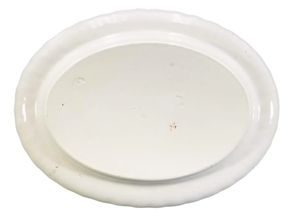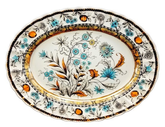 Platter, 13 x 10 inches. Black transfer with polychrome clobbering and lustre overglaze. Impressed maker's mark for W. T. Copeland & Sons. Impressed "84" indicates a manufacture date of 1884. Red painted pattern number "2/2110." This pattern features a wild and sinuous bouquet in the well. The border is wide and consists of several bands. The innermost band contains a series of fans with a half flower interspersed. A geometric chain is found between that and the widest border which contains four varieties of flowers repeated. A rope-like thin band completes the border.