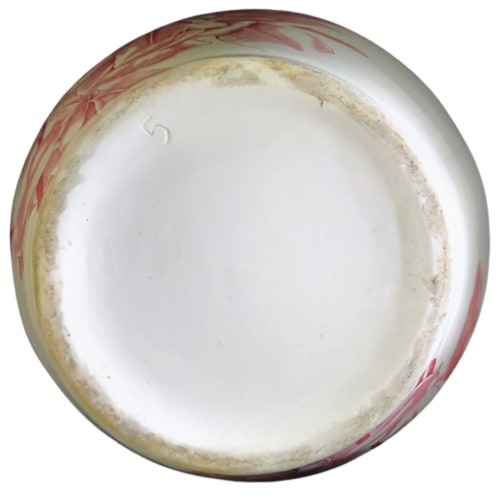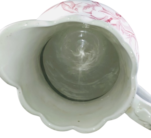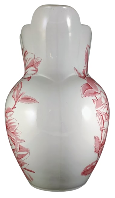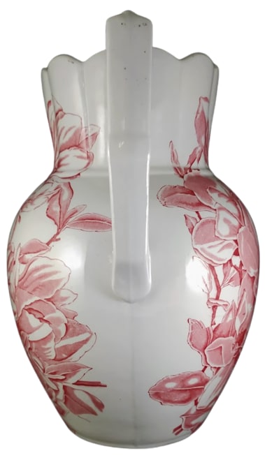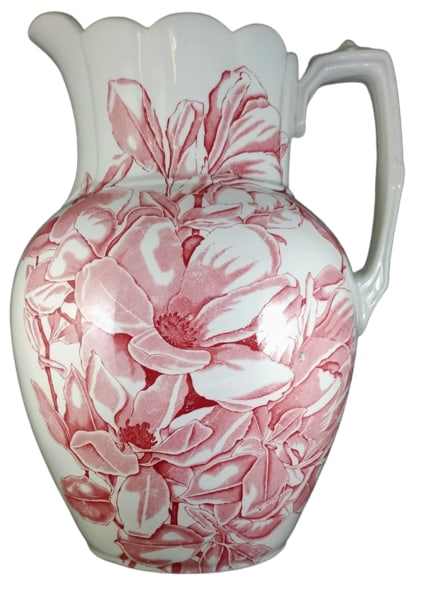 Pitcher, 12 inches tall. Red transfer. Unknown Maker. The only mark is the impressed number "5." This pitcher features the same dense pattern of magnolia flowers and leaves on both sides.