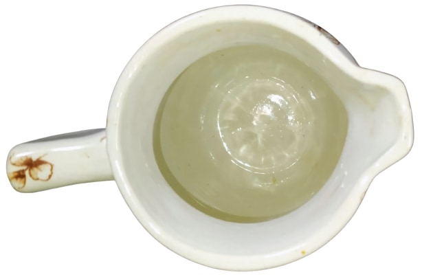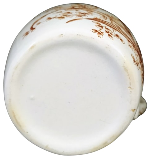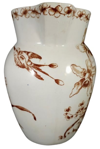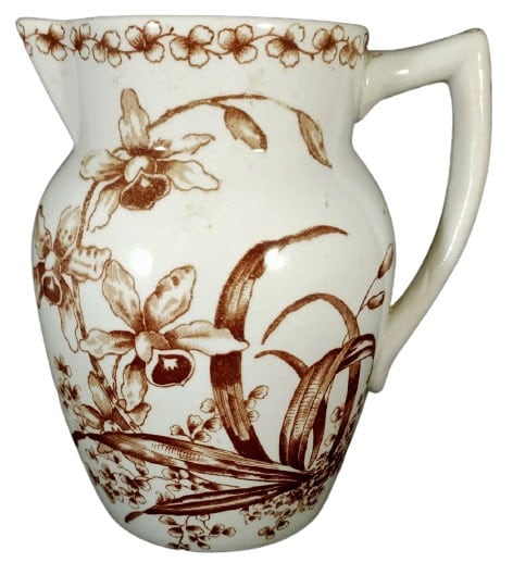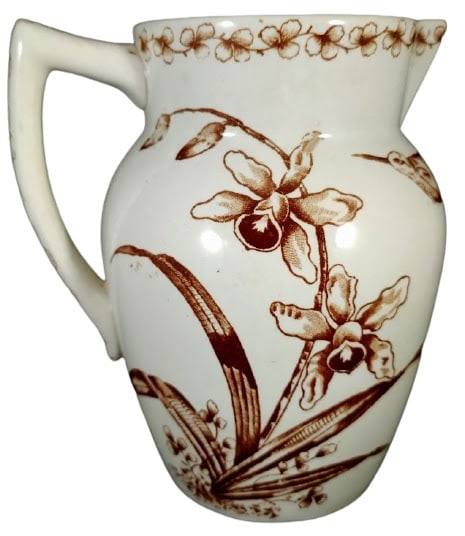 Pitcher, 6 inches tall. Brown transfer. Unknown maker. This pattern features orchids and maidenhair fern around the body, with a bird in flight. The birds has elaborate tail feathers, similar to a marvelous spatuletail hummingbird.