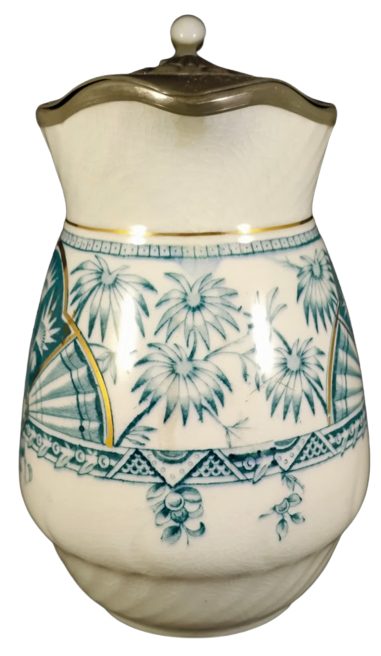Pitcher with pewter lid, 7.5 inches tall. Blue-green transfer with gilding. Printed maker's mark for the Ceramic Art Co. Ltd. This pattern features a trefoil composed of fans on either side with stylized palm fronds in the middle. This composition is repeated on the opposite side of the pitcher and is connected by palm fronds.