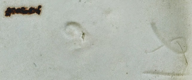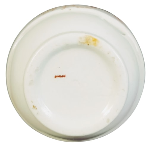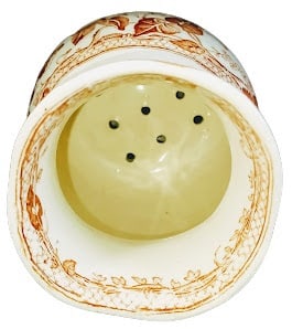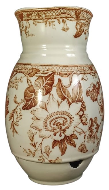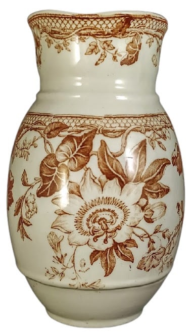 Toothbrush holder, 5.75 inches tall. Brown transfer. Unknown maker. This floral pattern consists of a trellis of netting or ropes encircling the base of the neck. From that, a vine is attached and flowers trail downward. Two sides feature passion flowers and the other two, geraniums. Both the inside and outside rims feature a border consisting of the same trellis and vines, although only leaves are present.