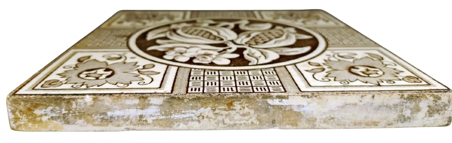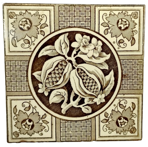Tile, 6 x 6 inches. Produced by Minton, Hollins & Co. and registered in 1882. This pattern features a central medallion with a leafy and blossoming pomegranate branch with two pieces of ripe fruit bursting open. The border consists of alternating boxes of stylized flowers and geometric checkerboards.