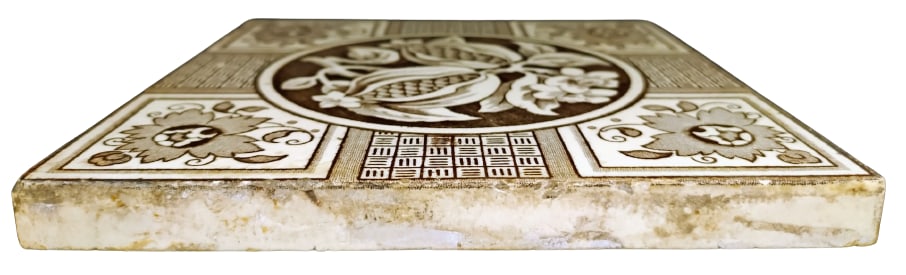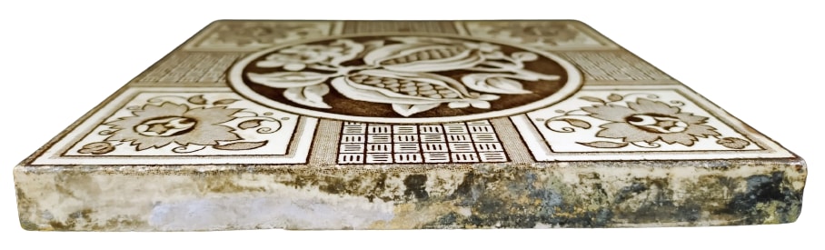 Tile, 6 x 6 inches. Produced by Minton, Hollins & Co. and registered in 1882. This pattern features a central medallion with a leafy and blossoming pomegranate branch with two pieces of ripe fruit bursting open. The border consists of alternating boxes of stylized flowers and geometric checkerboards.