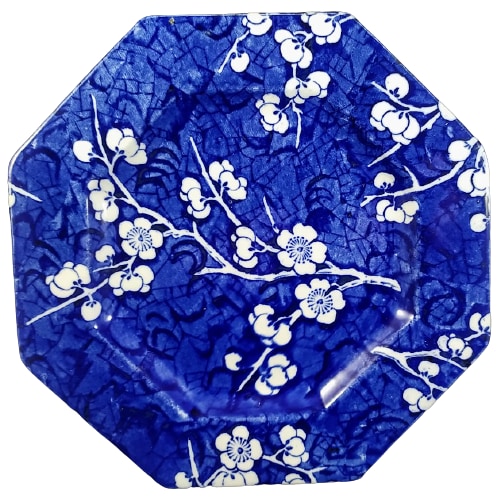 Plate, 8 x 8 inches. Blue transfer. Printed maker's mark for G. L. Ashworth & Bros. This pattern features a blue sheet pattern background of cracked ice with branches of prunus blossoms overlaid.