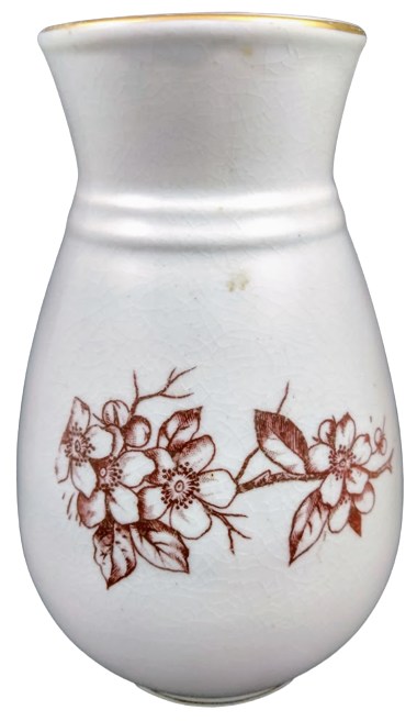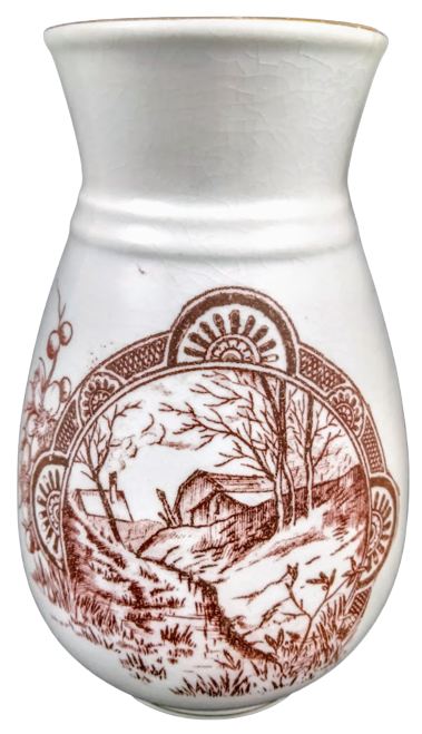 Vase, 6 inches tall. Brown transfer. Maker is most likely Wallace & Chetwynd of the Harker Potteries in East Liverpool, Ohio, USA. This pattern features a countryside scene with a small farmhouse and barn bordered by a geometric band and semi-circular cartouches filled with stylized flowers. The opposite side of the vase features a sprig of apple or prunus blossoms. The rim is decorated by a simple gilded line.