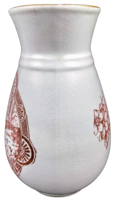 Vase, 6 inches tall. Brown transfer. Maker is most likely Wallace & Chetwynd of the Harker Potteries in East Liverpool, Ohio, USA. This pattern features a countryside scene with a small farmhouse and barn bordered by a geometric band and semi-circular cartouches filled with stylized flowers. The opposite side of the vase features a sprig of apple or prunus blossoms. The rim is decorated by a simple gilded line.