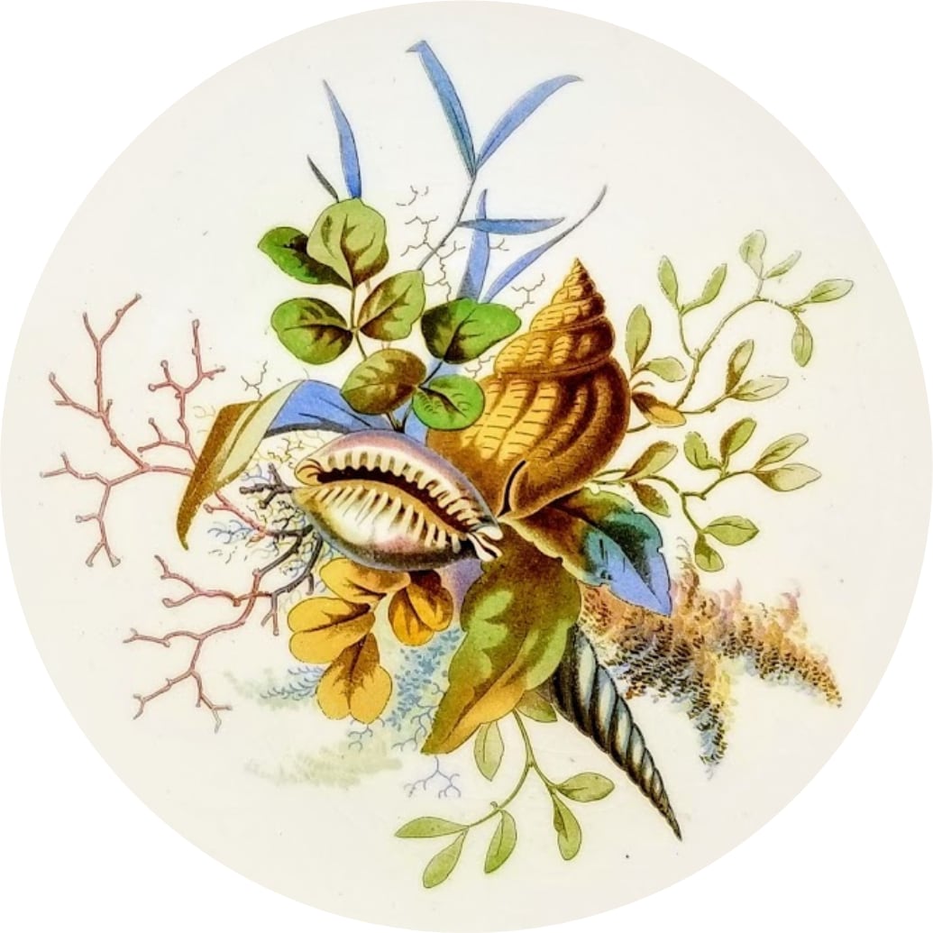 Plate, 9.25 inches diameter. Brown transfer with polychrome clobbering. Maker is Pinder, Bourne & Co. as seen in impressed letters on the reverse. There are also impressed numbers, 6-77, that indicate the date of June 1877 when the plate was made. The pattern is a striking one printed in many colors. The shells lay on top of a coral branch and several kinds of seaweed. There is no border.