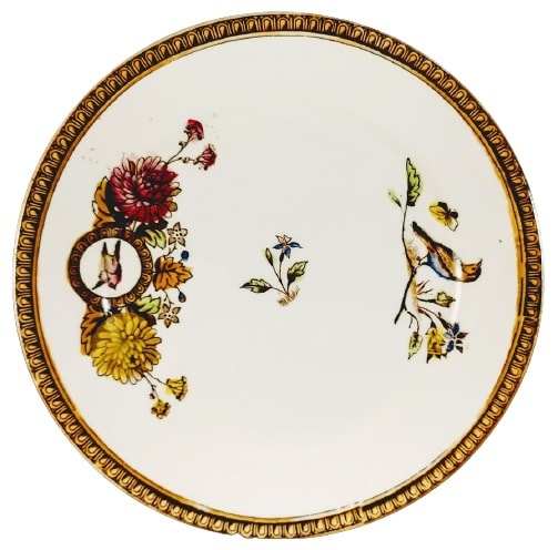 Plate, 7 inches diameter. Brown transfer with polychrome clobbering. Unknown maker. The Rd. No. indicates a pattern registration date of 1886. This pattern features three motifs placed along a straight line in the center of the plate. The largest motif consists of a flying songbird inside a circular cartouche laid over a spray of chrysanthemums and other flowers. Next to this motif is a small wildflower plant and then a motif of a songbird standing on the ground amongst wildflowers and leaves, looking towards a flying butterfly. The thin border consists of a repeated geometric shape.