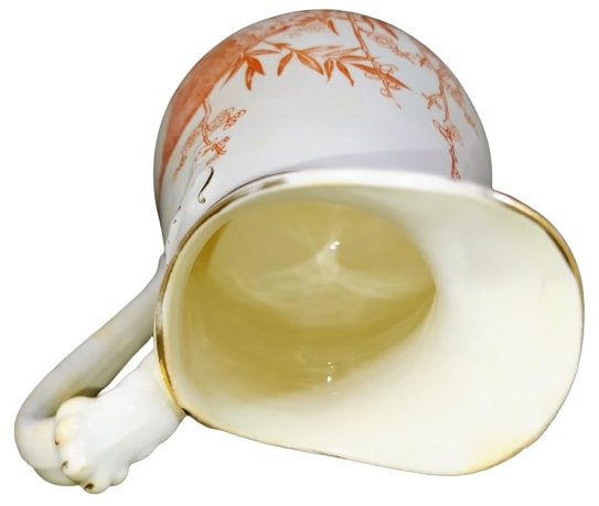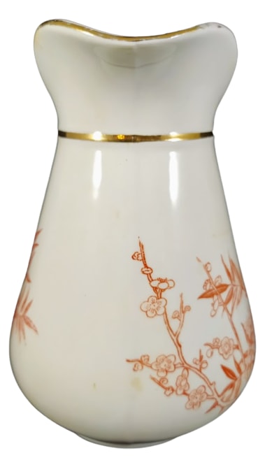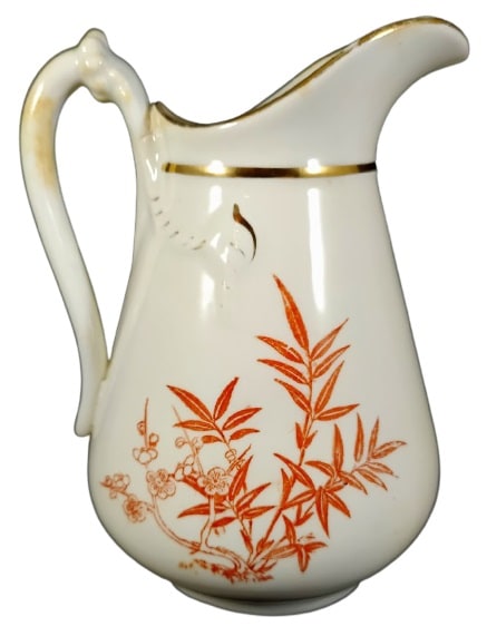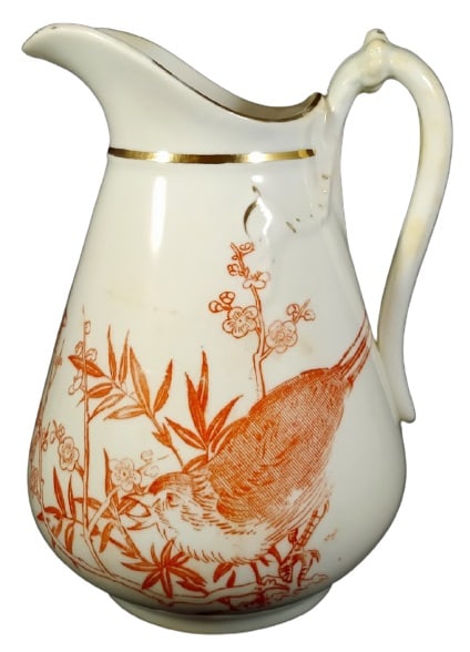 Creamer, 5.75 inches tall. Red transfer with gilding. No maker's mark, but the registry diamond indicating a pattern registration date of 18 February 1882, is the date that J. F. Wileman registered a pattern. The pattern features a squawking bird crouched on the ground amongst branches of prunus blossoms and leafy stems. The opposite side of the creamer features a motif consisting of the same prunus blossoms and leafy stems. The rim, neck, handle, and molding on the neck are decorated with gilding.