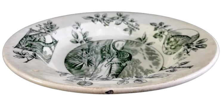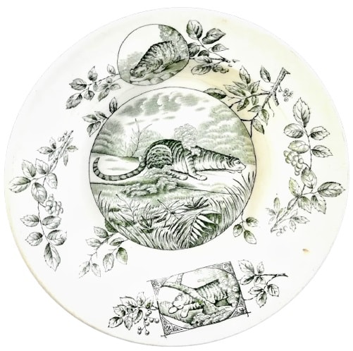 Plate, 8.25 inches diameter. Green transfer. Unknown maker. Printed retailer's mark for Boxer Bros. of Montreal, Canada. This pattern features a central image of a crouching tiger camouflaged in the bushes. There are grasses and palms in the foreground and trees in the background. The border consists of flowering and leafing branches with picture medallions on the top and bottom. The circular medallion depicts a crouching tiger on rock and the rectangular medallion features a tiger perched in a tree.