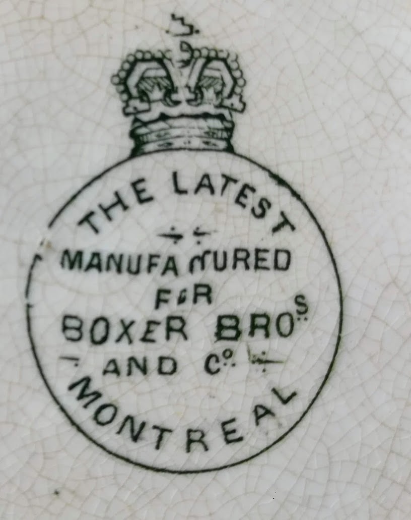 Boxer Bros. & Co. was located in Staffordshire Hall on St. Catherine Street in Montreal, Canada. They were ceramic importers and were known to import wares from J. Dimmock & Co. and William Brownfield & Sons.