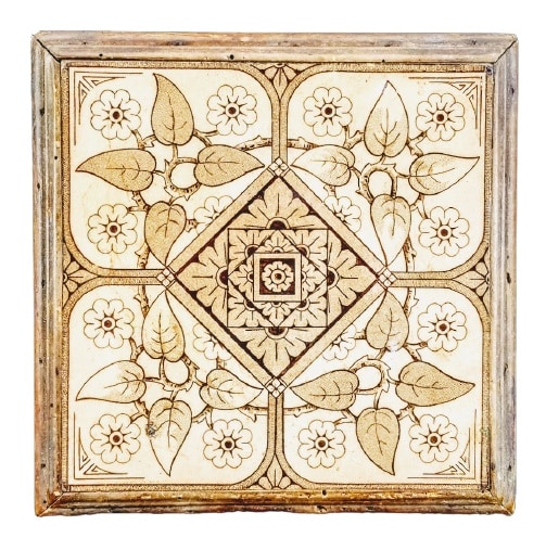Tile (6 x 6 inches) in wooden frame (7 x 7 inches). Brown on buff transfer. Unknown maker. The pattern is divided into four quadrants with a central diamond filled with concentric squares of stylized flowers. Each quadrant is connected by a twisting vine of leaves and flowers.