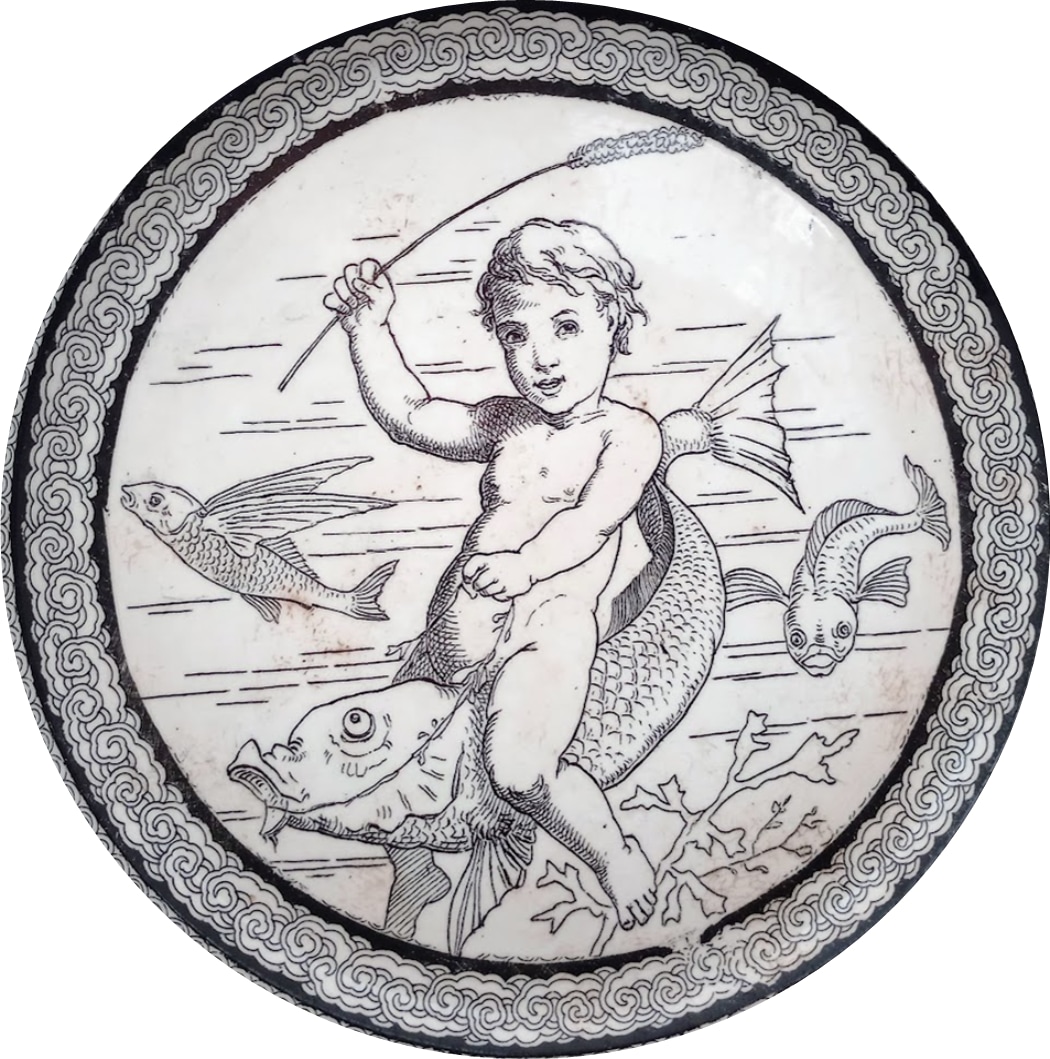 Plate, 10.25 inches diameter. Brown transfer. Impressed maker's mark for Josiah Wedgwood. The three-letter impressed date code of 'GCH' indicates a creation date of c. 1879. The center image of a water-baby riding a fish using a bulrush as a whip comes from a series of six tiles of water-babies and fish. The border consists of Wedgwood’s Mikado diaper and border pattern, which was used for many other patterns.