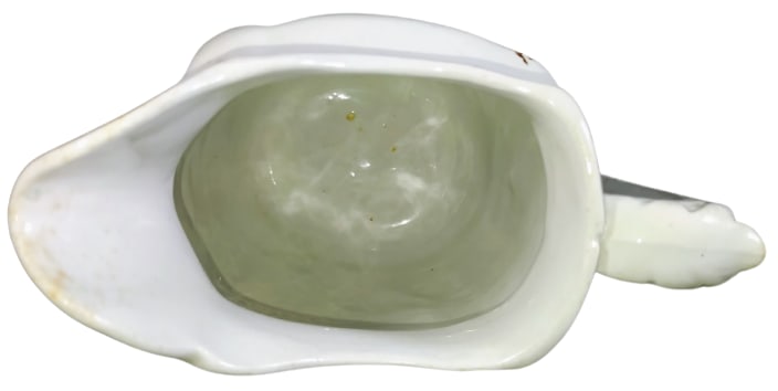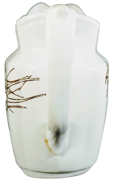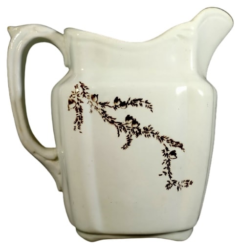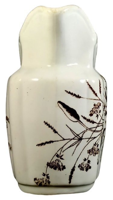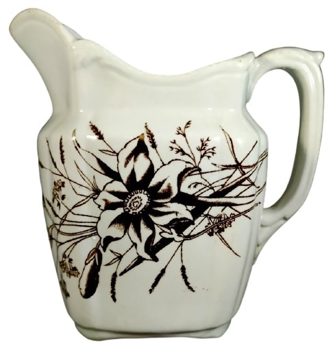 Creamer, 4.875 inches tall. Brown transfer. Unknown maker. This pattern features a spray of wildflowers on one side and a sprig with needle leaves and small flowers on the other side.