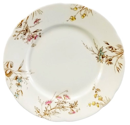 Plate, 6.75 inches diameter. Brown transfer with polychrome clobbering. Printed maker's mark for Johnson Bros. This simple floral pattern features six sprigs of different wildflowers extending from the rim towards the well of the plate.