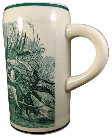 Mug, 7.25 inches tall. Green transfer. Unknown maker. This pattern features a scene of a male fairy dressed in ragged clothes and shoes carrying a burden of some kind from his head, drinking water from a large aloe-type plant. Flowering versions of this plant appear in the background to the right.