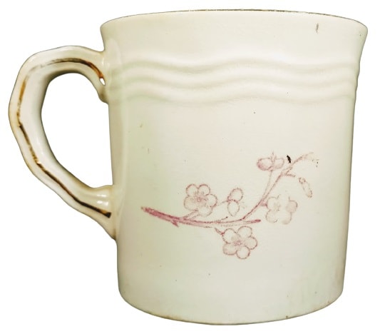 Mug, 3.5 inches tall. Red transfer with gilding. Printed maker's mark for Thomas Furnival & Sons. This unnamed pattern features an odd-looking bird perched on a flowering branch. The long beak suggests perhaps a woodpecker or a blackbird. Framing the bird on the left is a large stylized sunflower head with the center filled with horizontal geometric bands. The opposite side of the mug features a small, curved flowering branch. There are gilded accents on the handle and rim.