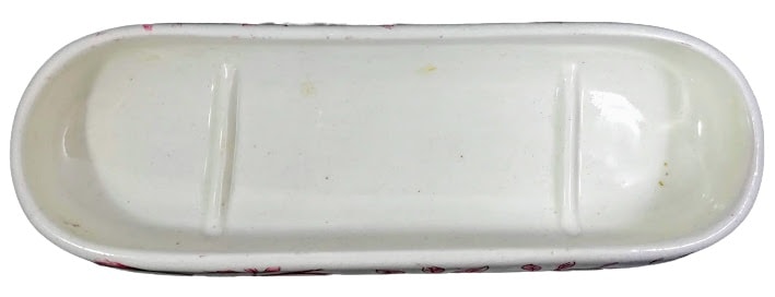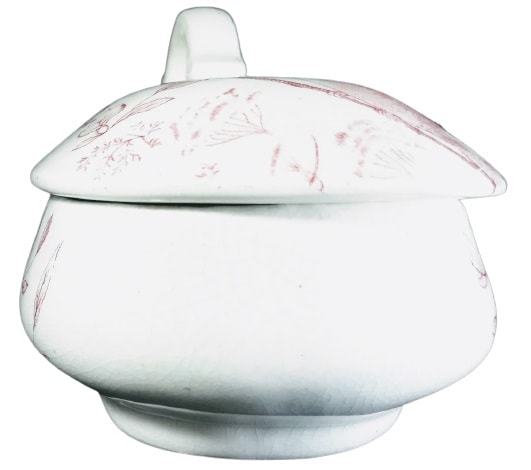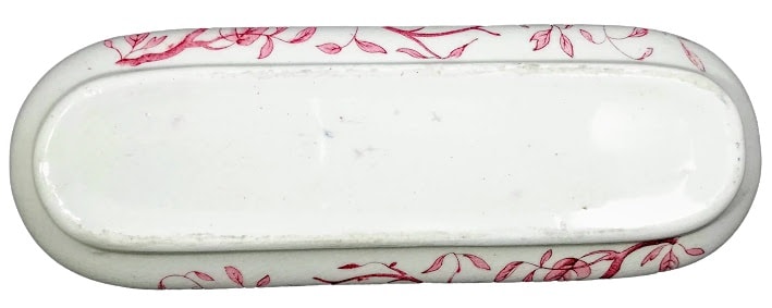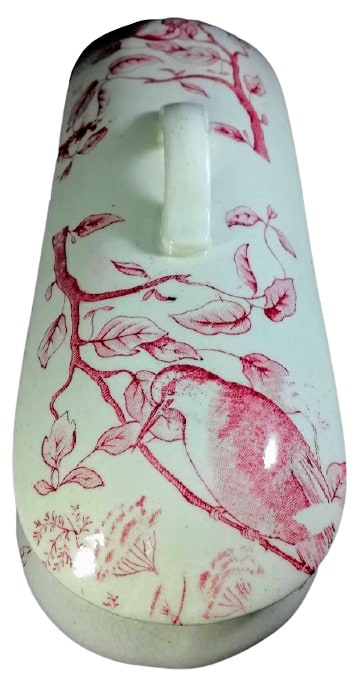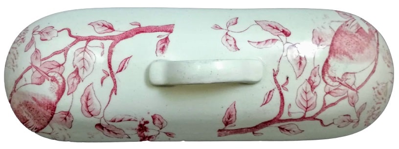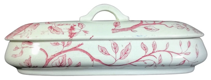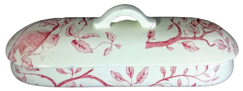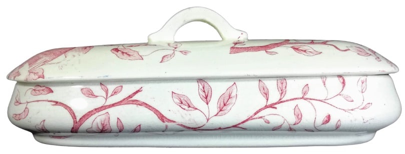Lidded dish, 9 x 3 inches. Red transfer. Maker unknown. This dish was originally part of a toilet service, which was a set of objects used at the dressing table. This pattern features leafy branches wrapped around the sides. The same leafy branches appear on the lid, with the addition of a woodpecker on either end and some flowers that look similar to Queen Anne's lace.