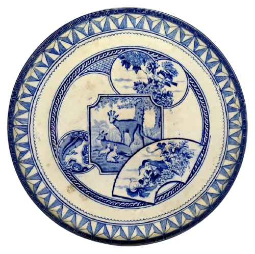 Trivet, 7 x 7 inches. Blue transfer. Maker is J. Dimmock & Co. The registry diamonds indicates a registration date of 7 June 1880. The pattern features an asymmetrical arrangement of cartouches filled with elements from nature. The central cartouche, a square with inverted corners, features a male and female roe deer with two fawns in a forest. The circular cartouche to the left contains a highly-stylized foliage motif. The double-circle cartouche contains an image of a songbird perched amongst shrubs with three different types of flowers. The fan-shaped cartouche contains flowers and foliage, including chrysanthemums and a form that looks like an upturned turnip. The border consists of an outer ring of the key-fret pattern and an larger inner ring of pyramidal shapes with shading giving a 3-dimenional illusion.