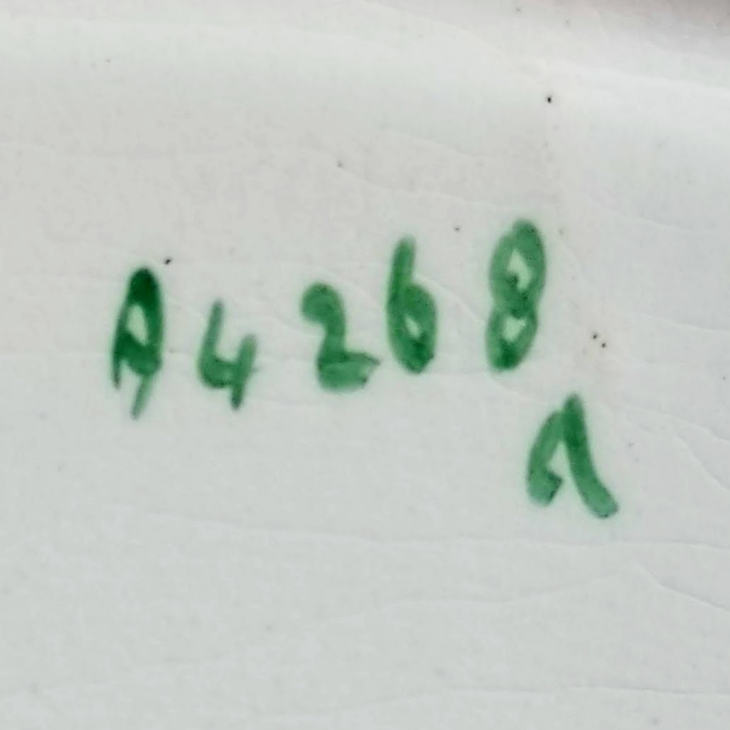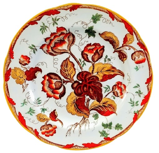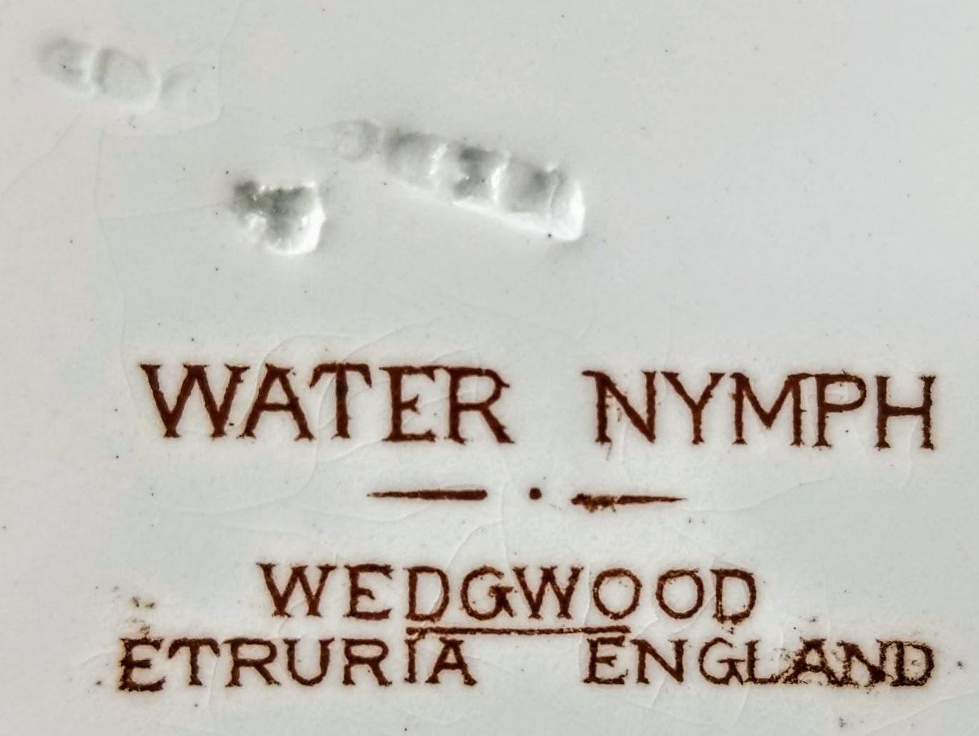 Plate, 10.1 inches diameter. Brown transfer with polychrome clobbering. Impressed and printed maker's marks for Wedgwood. The painted pattern number "A4268" indicates Queensware dinnerware, not gilt, 1875-1932. The impressed date code indicates a manufacture date of 1903. The "Water Nymph" pattern was one of four pearlware plates printed and painted with botanical and floral patterns in a typical 19th-century style. The stylistic flowers, buds and leaves are decorated in lovely fall colors. The narrow border consists of a rope like feature with red-painted leaves tucked in at uneven intervals around the plate. It does not resemble the narrow, grassy water plant weed found throughout the world known by that name.