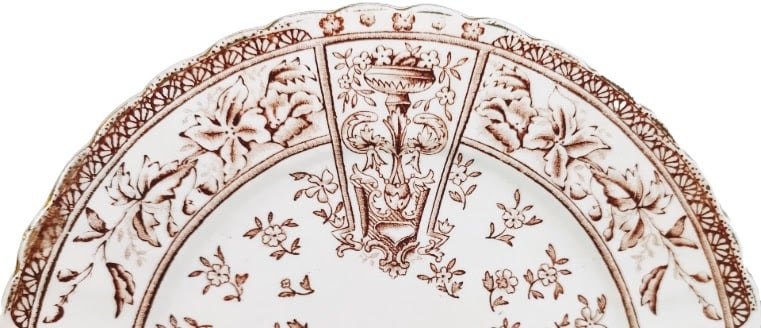 Plate, 6 inches diameter. Brown transfer. Printed maker's mark for Grimwade Bros. Registration number dates the registration of this pattern to 1892. "Winton" is primarily a border pattern featuring alternating bands. A four equidistant points around the plate, vertical rectangular bands feature elaborate flower urns with trailing flowers. In between these are four horizontal rectangular bands featuring blowsy flowers and foliage. Beneath both these bands are small stylized flowers that circle around the center of the well. A thin border of stylized flowers and half-flowers with a ling of gilding circles the rim of the plate.