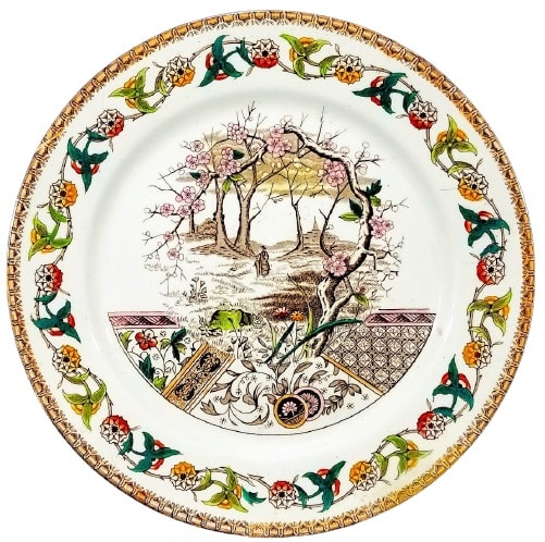 Plate, 8.75 inches diameter. Brown transfer with polychrome clobbering. Printed maker's mark for T. & R. Boote. The registry diamond indicates a pattern registration date of 13 January 1883. The inclusion of "England" in the mark indicates a manufacture date of c. 1891-1920. The pattern features two figures walking through a cherry orchard. There is a large cherry tree branch overarching on the right. The branch rises out of the bottom half of the plate which is a composite of geometric and floral patterns. There is a church in the distance. The border consists of a chain of flowers.