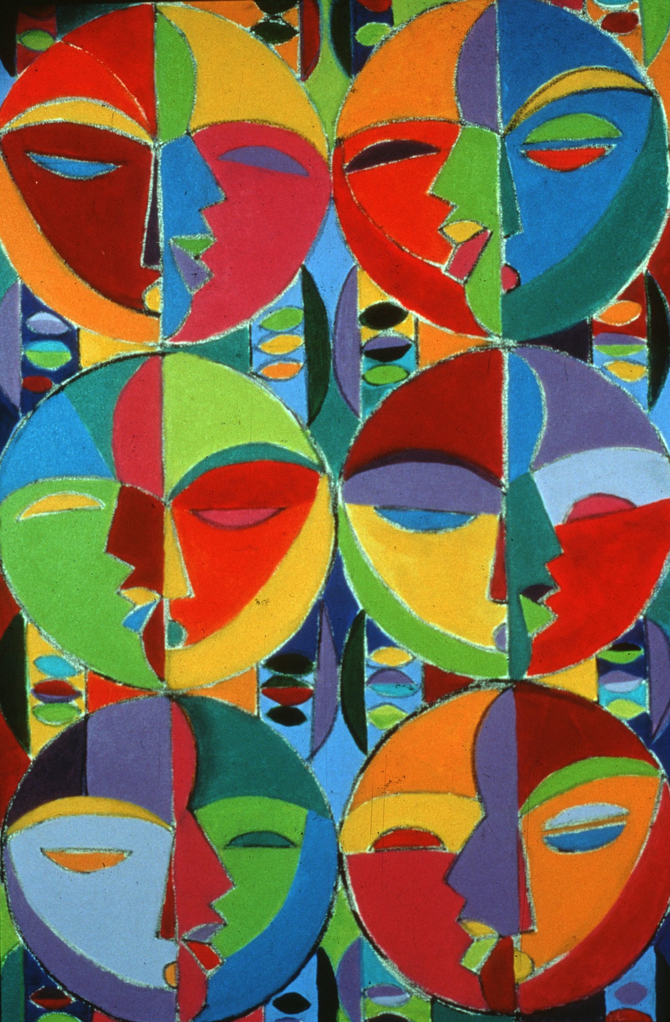 I do not attempt to create a realistic image when I am drawing from an African carving. I take the essence of the image and create my own rendition of it. I enjoy playing with the geometric shapes of the images and incorporating patterns into a piece. I love working with bright colors, testing one color against another (i.e., greens and oranges next to purples and/or turquoise blues next to reds and magentas in an attempt to create something eye-catching – good feelings and an explosion of color!). An artist colleague described my art as Expressions of Africa.
