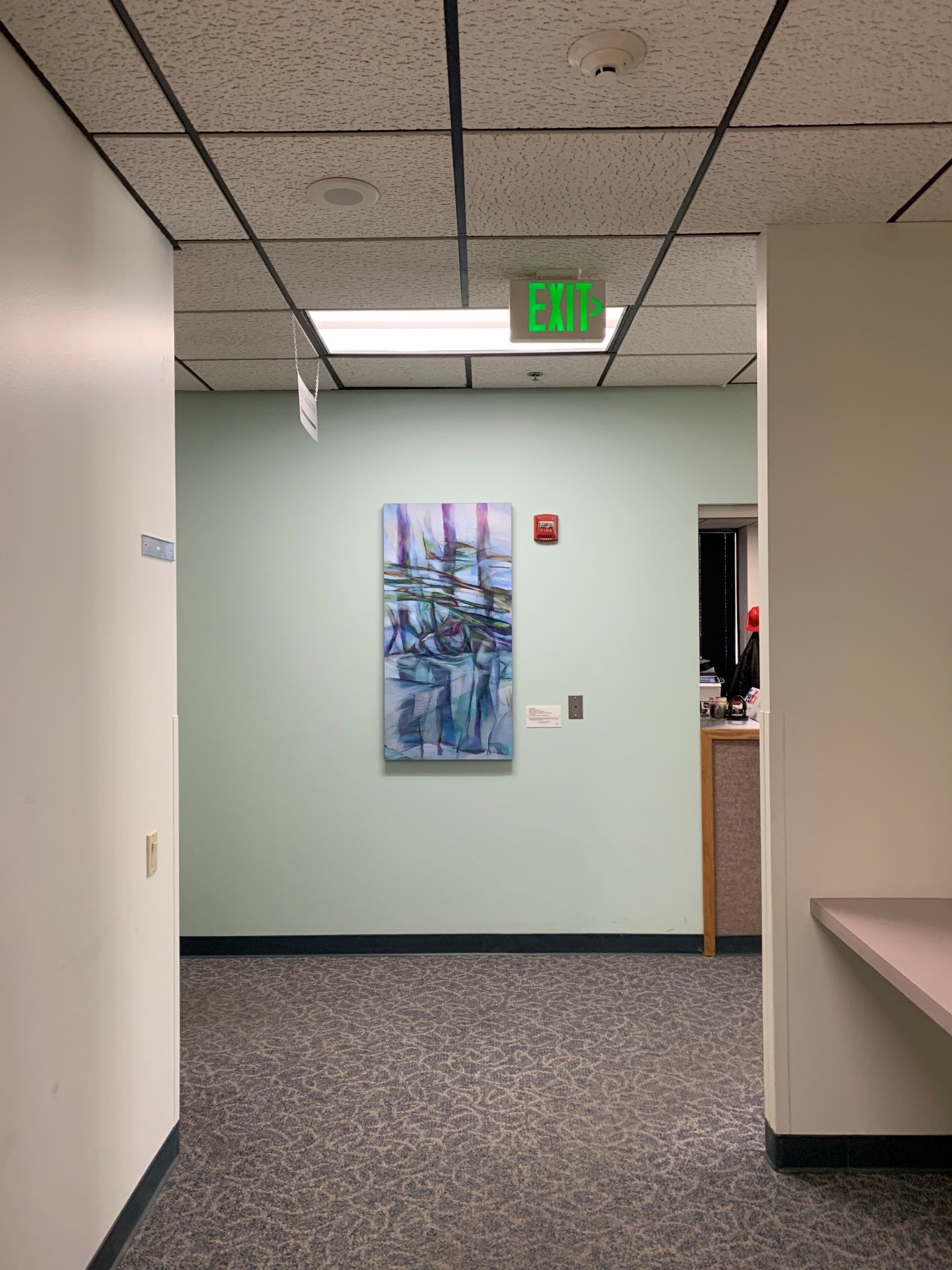 Artist’s Statement: I make art for and about public places. Painting landscapes, I love to bring the woods, creeks, mountains, waterways of the natural world indoors to where people are at work, and in this building, to expand the aquatic island atmosphere outside to a tranquil forested interior.