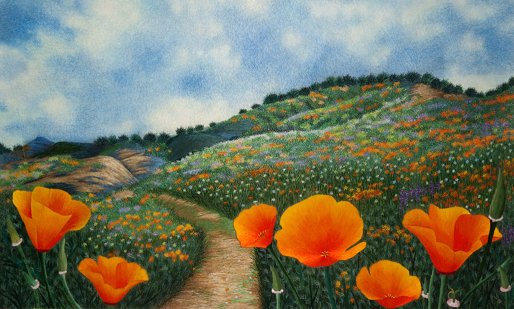 Yan Inlow’s highly detailed hand‐embroidery work is inspired by Chinese and Japanese artistic traditions but with a contemporary approach to the traditional technique. Her work features tranquil images such as hillsides with California poppies as well as other plants. Inlow states, “The connection between me and embroidery is shown by every stitch,