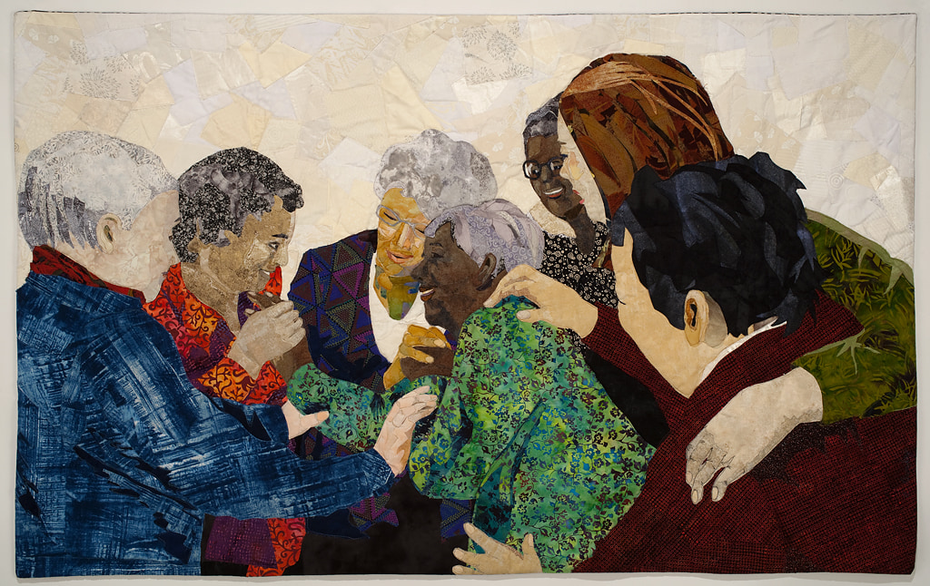 Alice Beasley’s large, fabric quilts depict people captured in the middle of celebratory moments. “I hope that viewers will be drawn into each group and experience the healing joy that friendship can bestow on us at any age and at any stage. The happiness we experience in a special moment is magnified tenfold when we experience it with others who love and care about us.”
