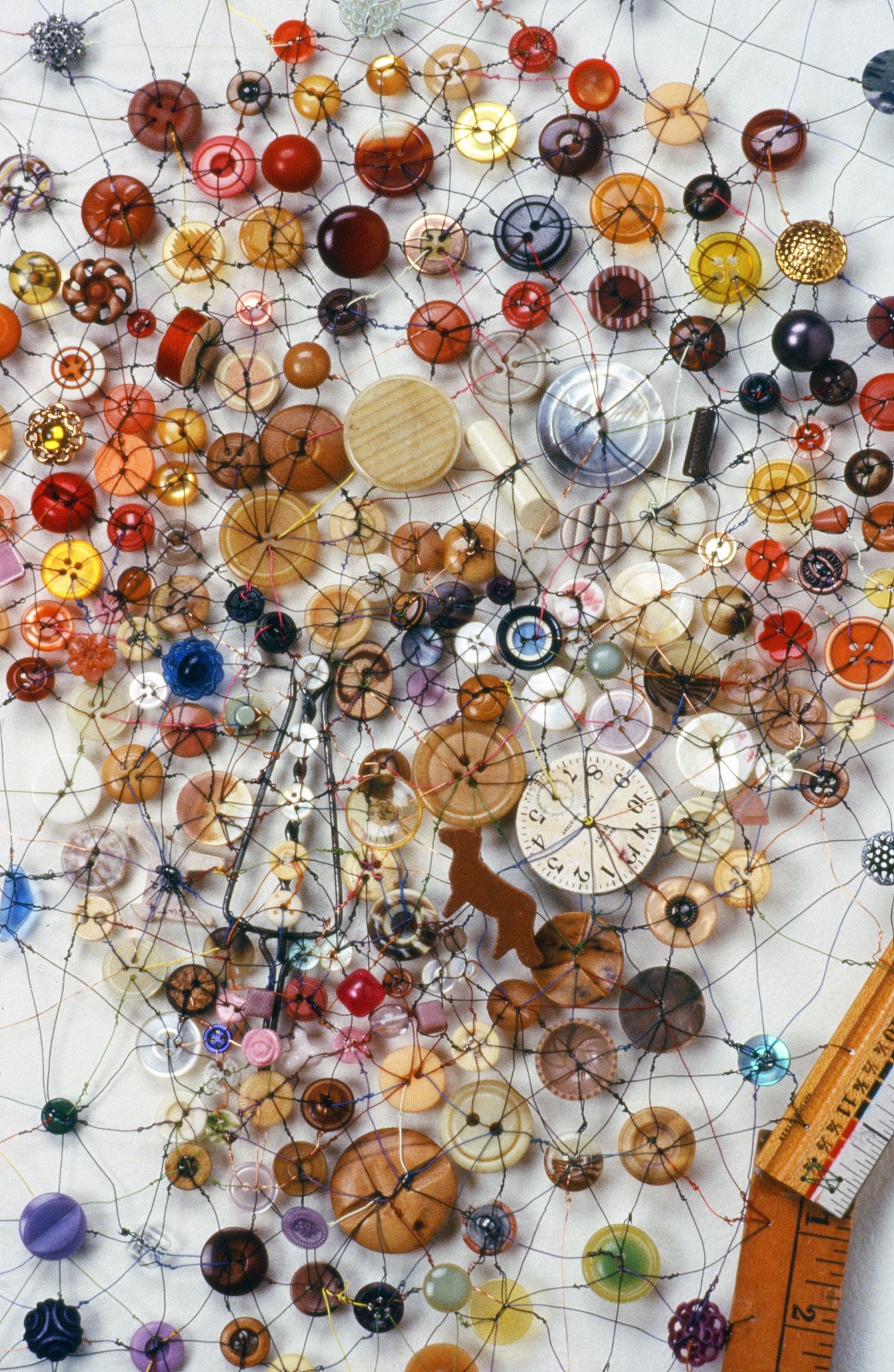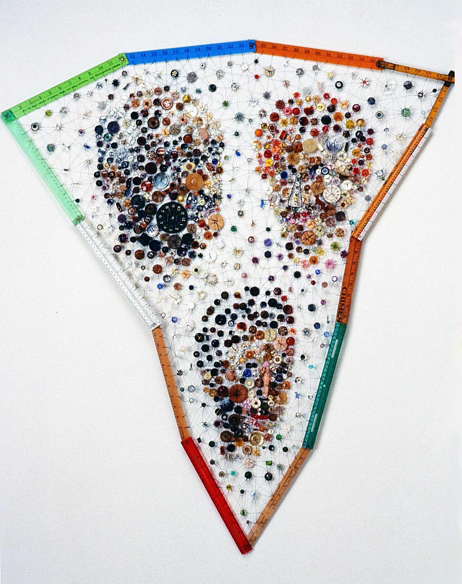 Artist Statement: Buttons have made cameo appearances in much of my previous work; in this series they are the primary material with which I construct family portraits. My parents were upholsters and my earliest memories are of playing in their shop with piles of vinyl and foam rubber. I have sewn since I was a child and the stitch plays a major role in my work, so it was natural to join the buttons together to forma reconstructed family portrait.
