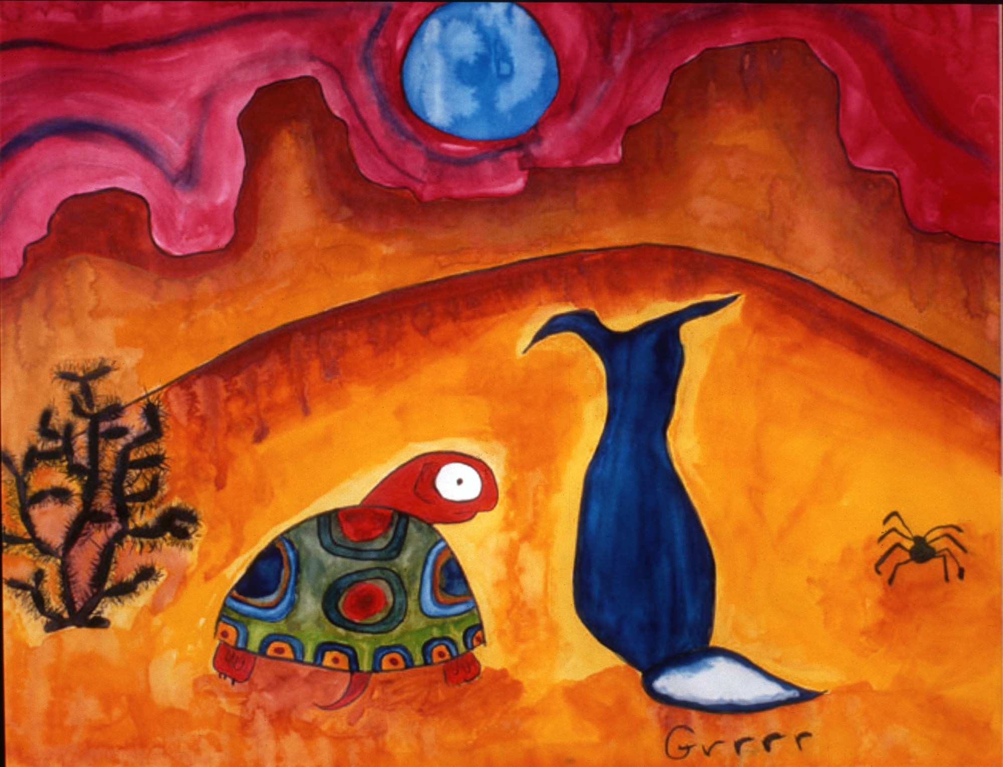 In the early 1990s, I moved to Tucson, Arizona on a quest for a more profound creative self. I became quite enamored of the Sonoran Desert. It is a very spiritual place and my own creativity became revitalized there. I had been primarily involved with the performing arts up until then. In the desert, I began a story and series of paintings that became Zonk, the Dreaming Tortoise, published in 1999. Although technically this could be called an illustration, I consider myself more of a painter and these stories the vehicle or discipline for my work.