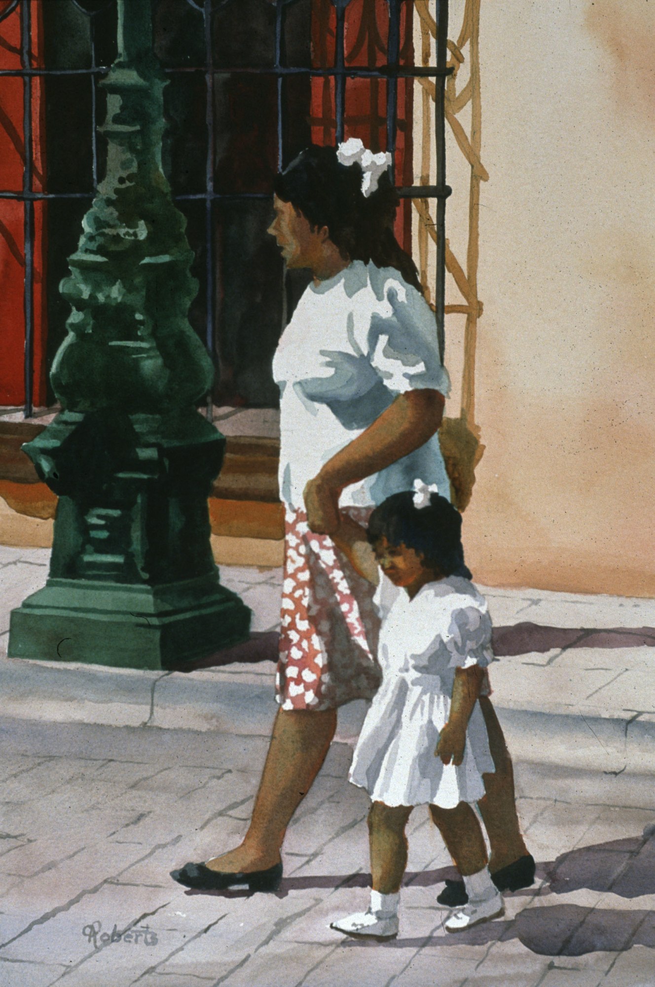 In Crossing the Street, the building and the lamppost show a street in Oaxaca, Mexico. The mother is clearly making sure her daughter is safe. I like strong design elements in my artwork. In this case, the composition is basically two strong verticals (the lamppost and the figures) and one horizontal (the line of the sidewalk). Because the major compositional lines are parallel to the edges of the painting, it is given a sense of calmness or serenity.
