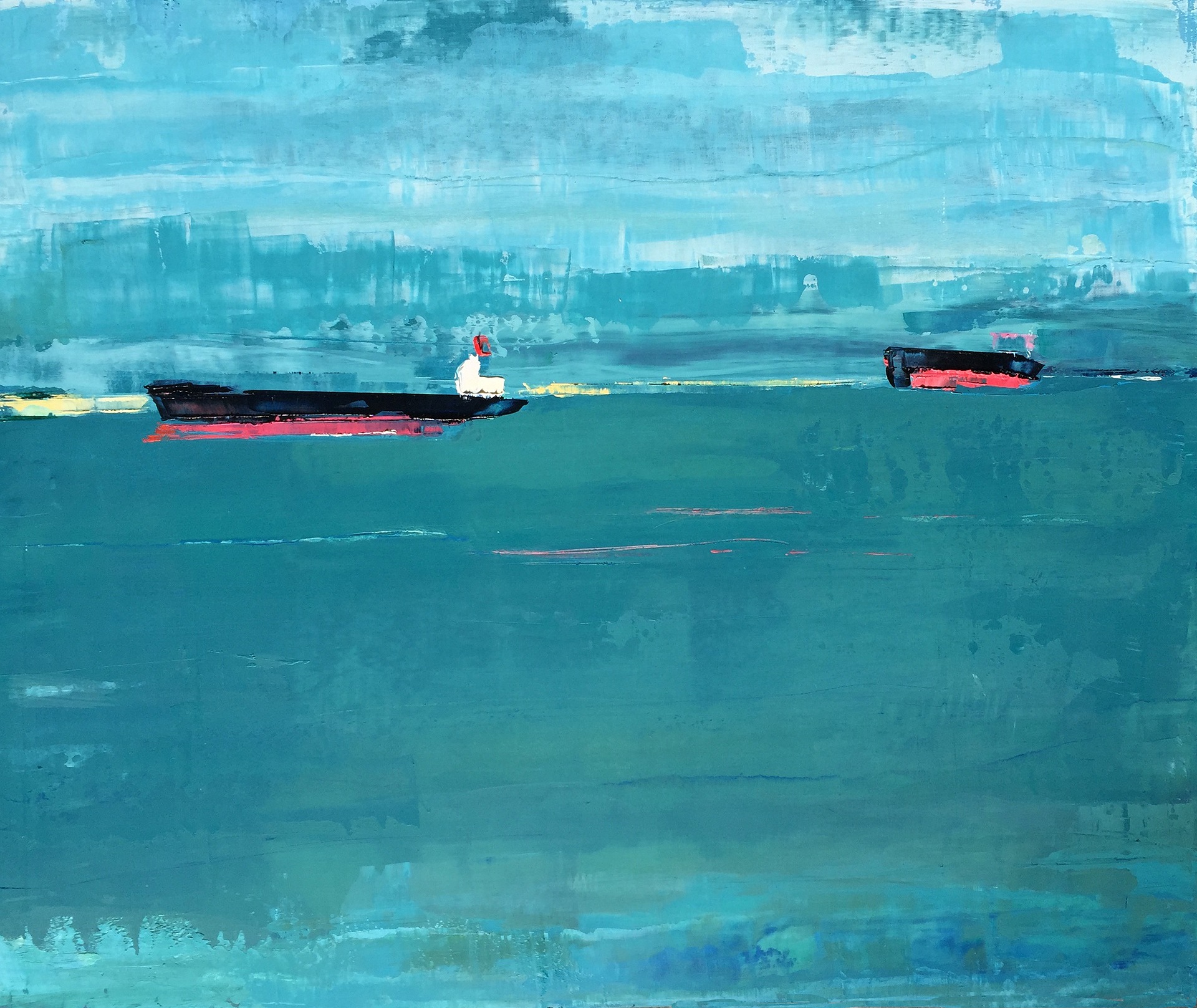 Artist’s Statement: Industrial yet romantic, large cargo ships seen from far away are imbued with poetry and are symbols of freedom and new horizons. To me, they are formidable, proud and beautiful, and they keep appearing and disappearing in new ways that stretch my way of seeing. As I drag the oil paint across the wood panel with broad strokes, using metal blades, I delve deeper into the emotional seascape that presents itself every day, as the vessels traverse the scene, or rest for a while at anchor until their next adventure.