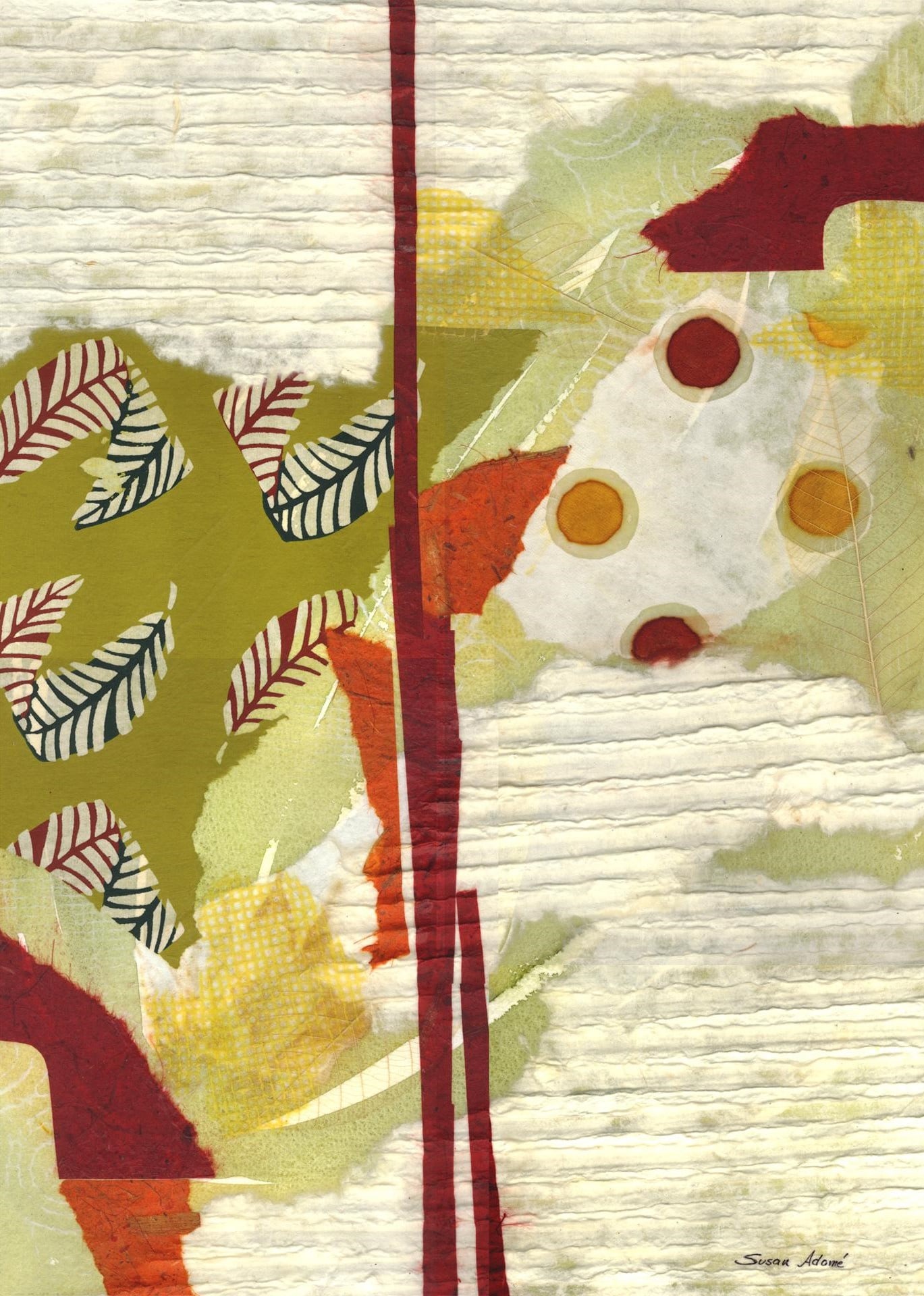 Artist’s Statement: This collage is created on a watercolor painting, which sets the color tone for the artwork and gives the piece a feeling of movement. A variety of materials have been incorporated, including gold leaf and papers from India, Italy, and Japan as well as local papers. The lines and circles in the work give the composition grounding, strength, and unity.