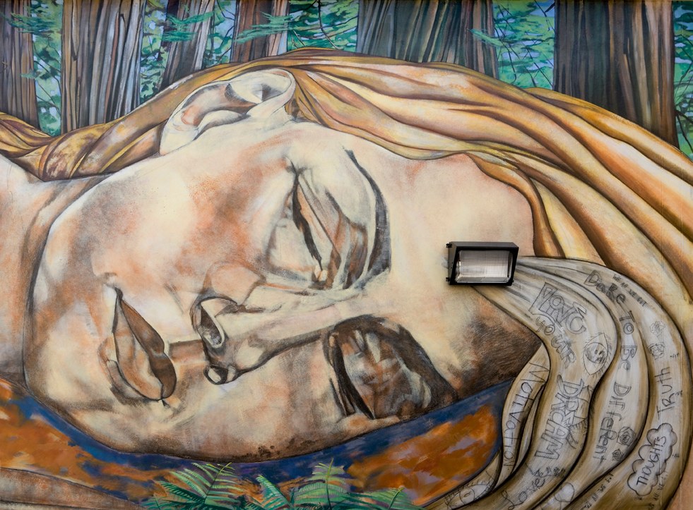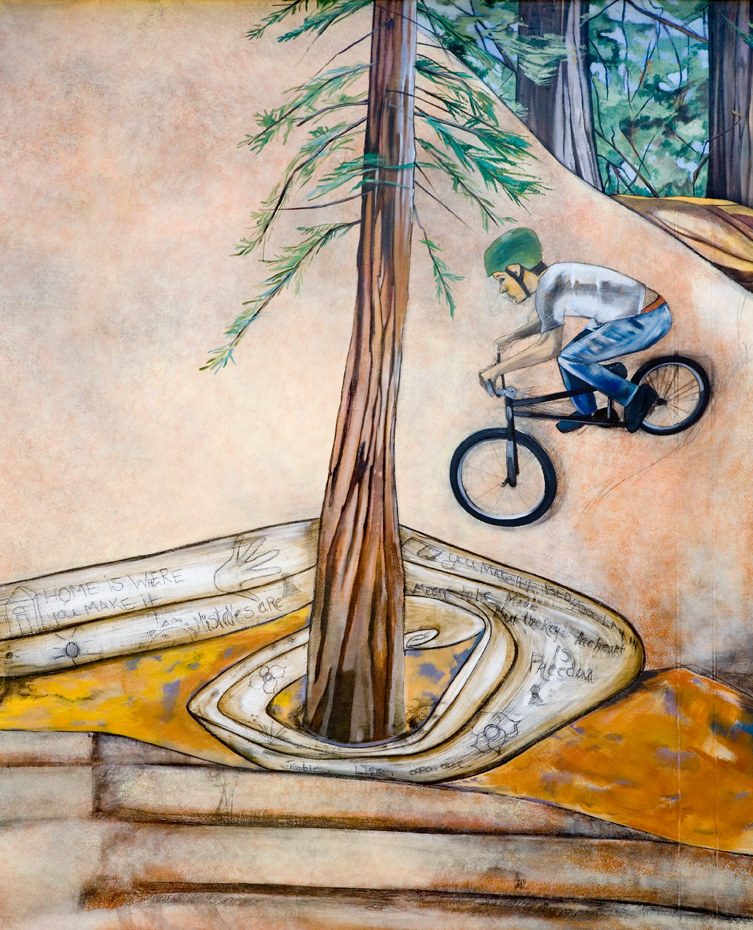 Artist's Statement: Dream of Redwood Trees is a meditation of hopeful things to come, and is based on a detained youth’s dream that I learned about at the roundtable discussion with the youth. In the mural, a youth is dreaming of a rock submerged in a redwood forest. Words and images written by detained youth during my workshops at the old Juvenile Hall snake through the mural and speak to the viewer. A dream box travels along the trail, and inside, a youth sleeps at home and dreams of a beautiful night sky while two youth bike along the trail.