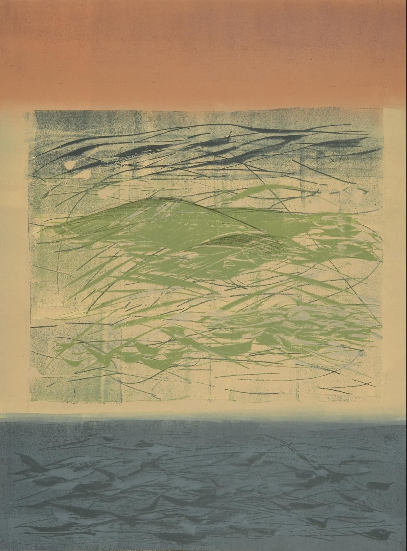 Artist’s Statement: These monotypes were created in single passes through the press using the viscosity technique, in which inks of varying thickness resist each other on the plate. The textures and juxtapositions of color that result from this commingling of inks are rich and organic, dense yet breathing, like those found in nature. The images that emerge in the process are often landscapes, both figural and abstract, arising like dreams out of some deep reservoir of memory and experience distilled to their essences. The specific details of the place or object is not what is remembered; what arises is a feeling—of immutable nature, of vastness and distance, of the movement of air and wind, of heat and cold and silence, of the breathing of plants and water and stone.