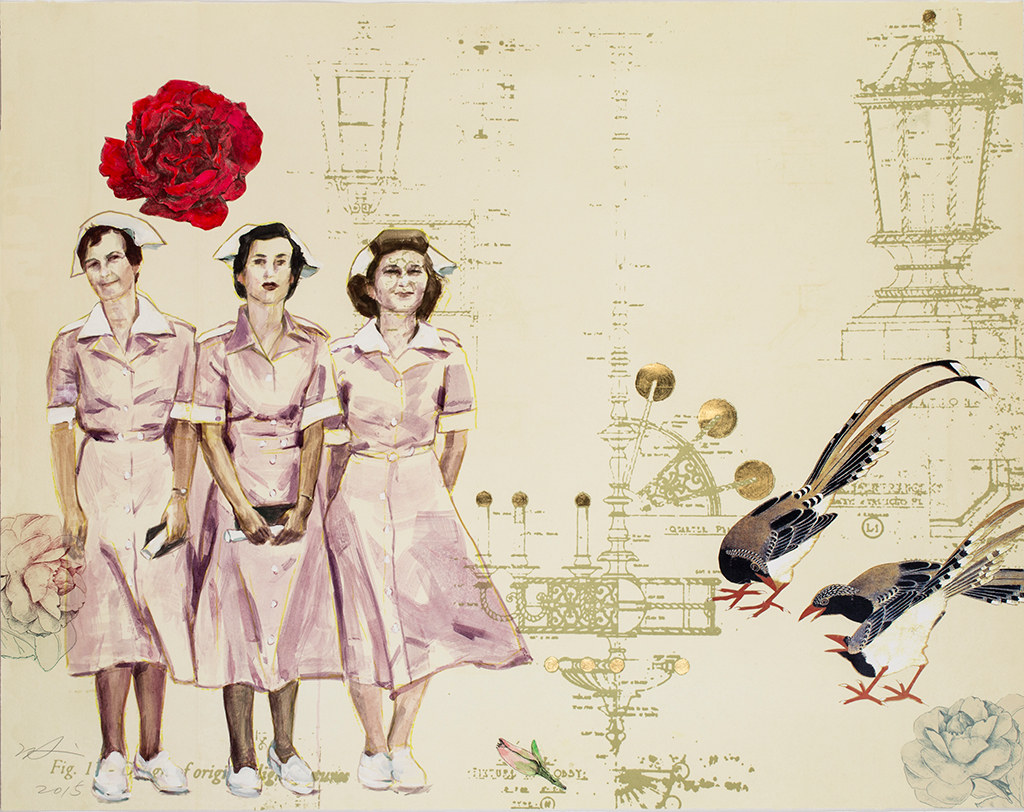• Watercolor, gouache, aquatint with softground etching, color photocopy, gold leaf and chine collĂ©