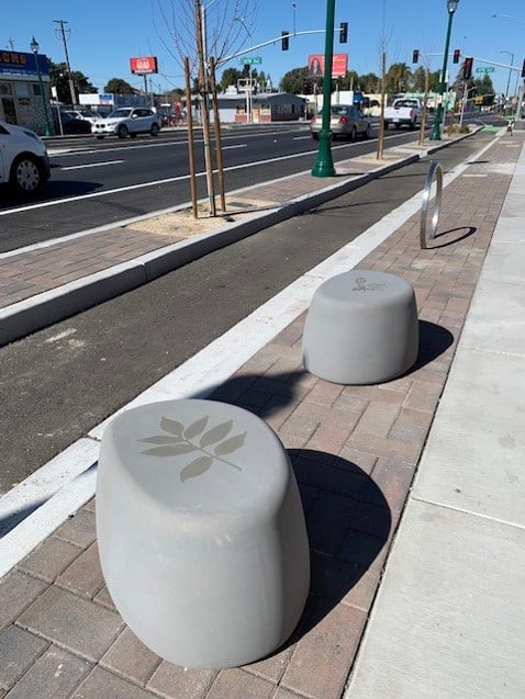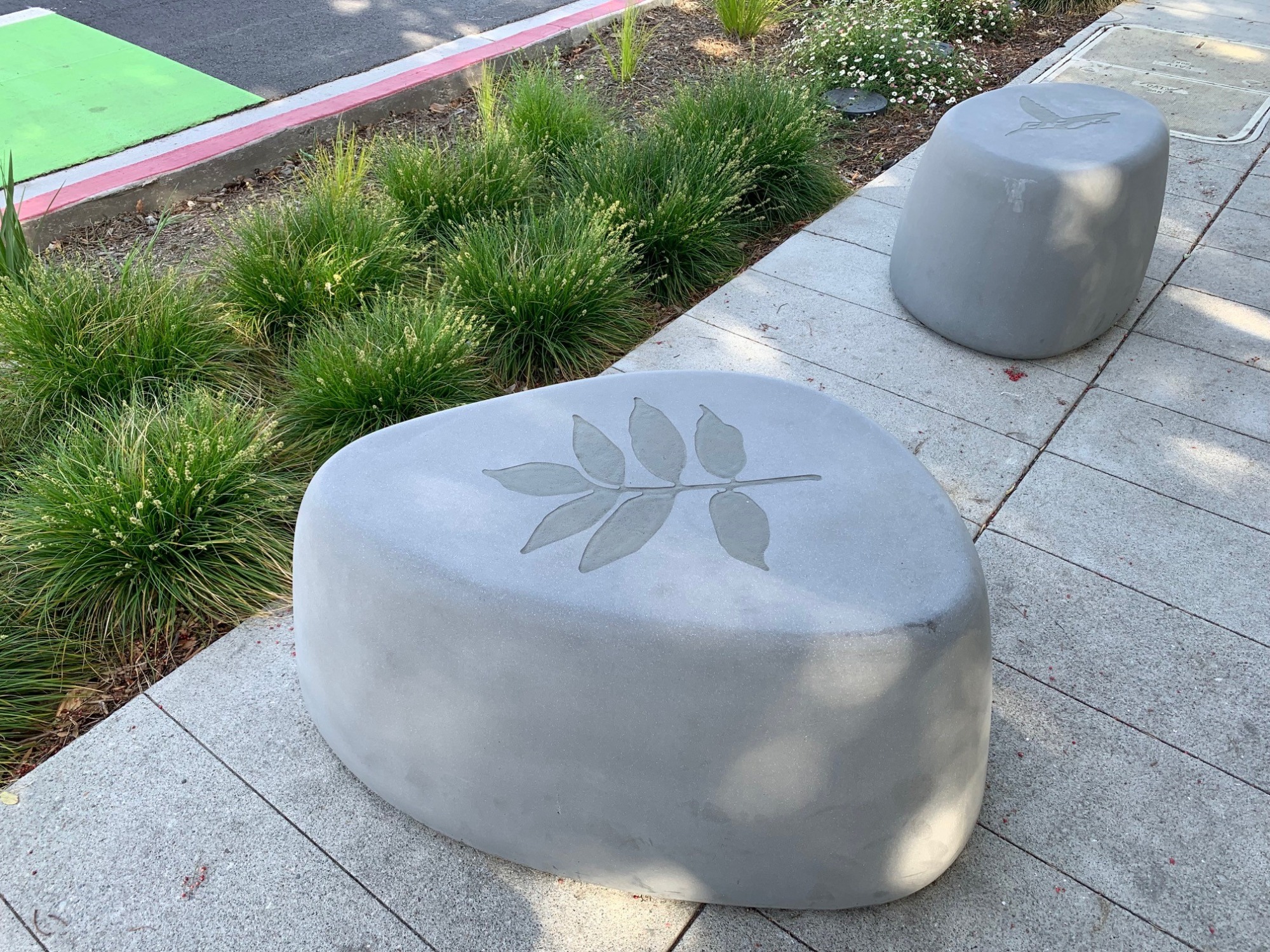 Seating: ‘Pebble seats’ can be found throughout the project site and feature designs that are connected to the imagery on the cut metal panels. The designs are sandblasted onto to the tops of the seats. Community members will find a variety of images including Ash Tree leaves, butterflies, hummingbirds, sunflowers, apples, lemons, plums, and a bee pollinating a flower amongst other designs.